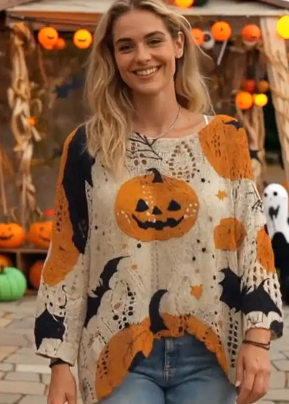 Celebrate the season in style with the Halloween Pumpkin Print Knit! Featuring a cozy, breathable knit fabric, this fun and festive top showcases playful pumpkin, bat, and spiderweb designs. With its relaxed fit, it’s perfect for layering or wearing on its own, making it the ultimate piece for embracing the spooky spirit of Halloween.